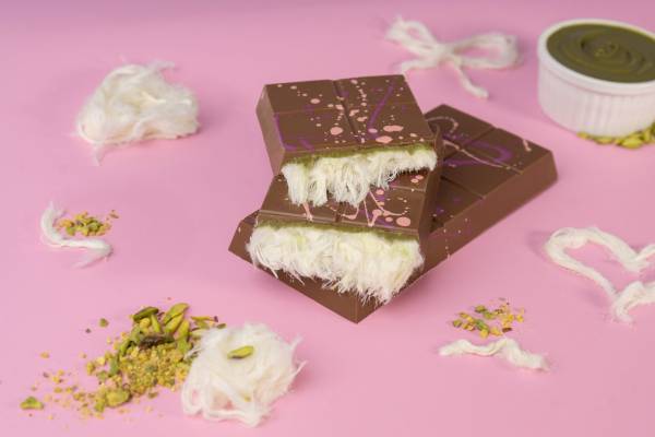 Fine, cottony strands of “Angel Hair” meet smooth pistachio cream, melting softly on the palate. The elegance of traditional Turkish delight is reborn in a Dubai-inspired chocolate creation.